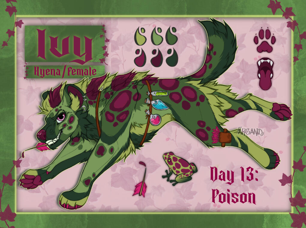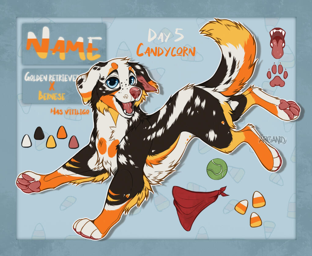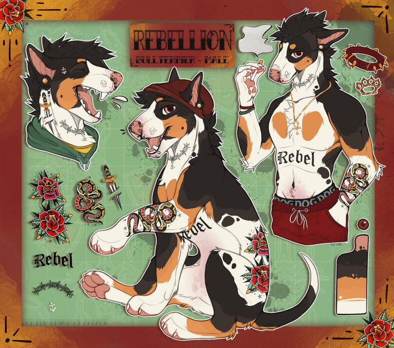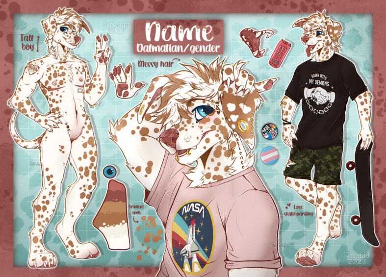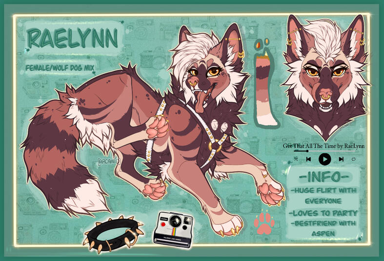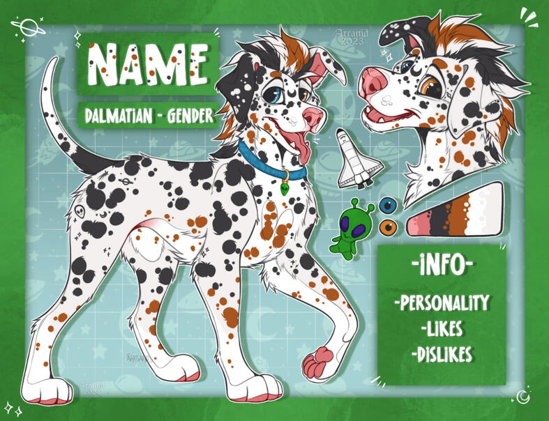 (includes headshot, fullbody, pawpads and mouth close up, 2 items, color pallete, name, info box )