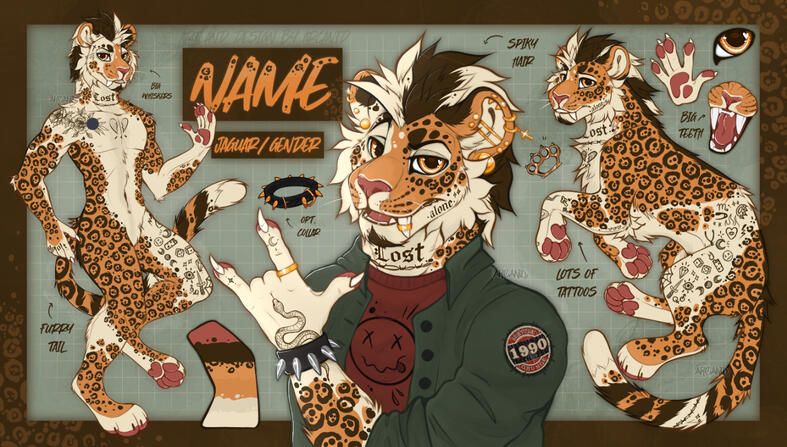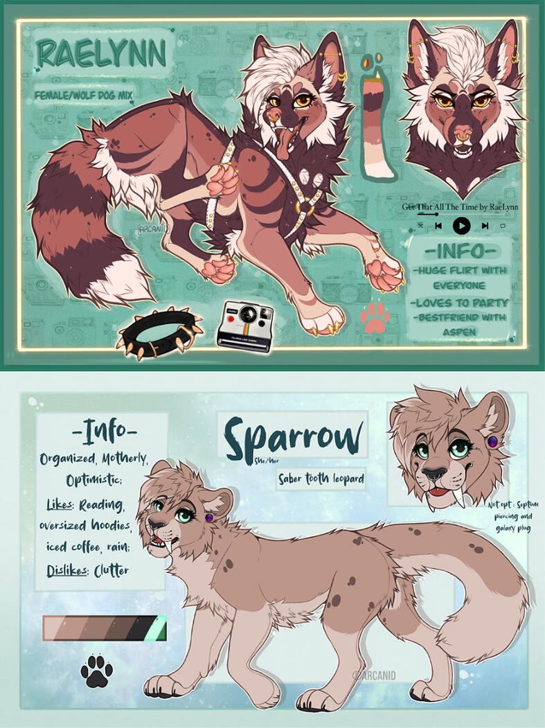 All the info about the design you want:(includes fullbody, headshot, pawpads and mouth close up 2 items, color pallete, name and info box* optional)